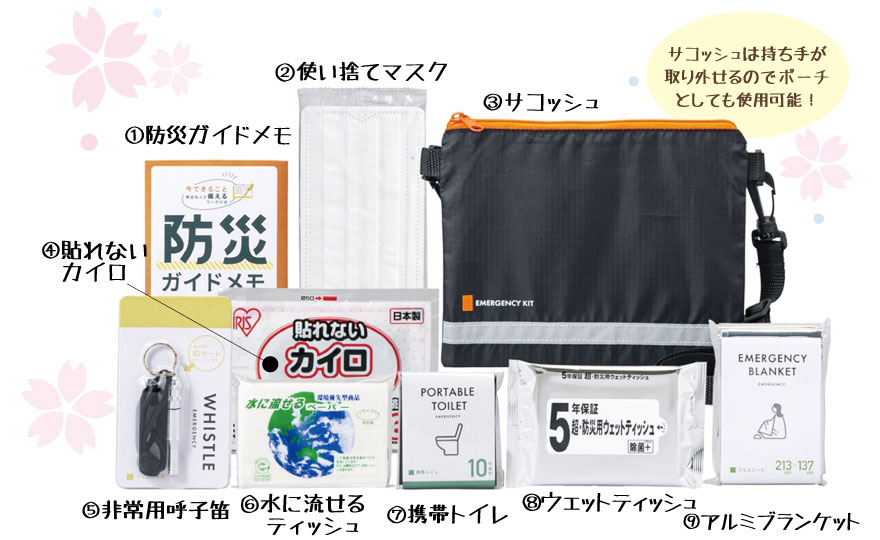 | セ ッ ト 内 容 | サコッシュ、アルミブランケット、ウエットティッシュ(20枚)、水に流せるティッシュ(10枚)、使い捨てカイロ、使い捨てマスク、携帯トイレ(1回分)、非常用呼子笛、防災ガイドメモ |