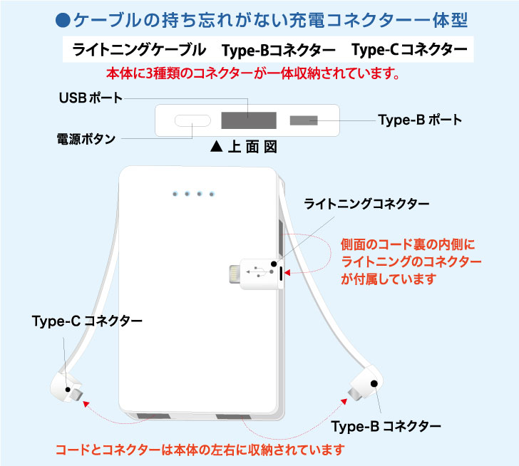 | 付 属 品 | コネクターは本体に収納されてます。 蓄電用USBコード 取扱説明書・保証書 |